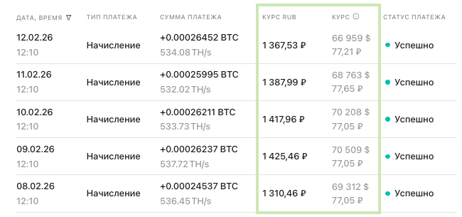 При одинаковом объеме добытых BTC сумма в рублях в разные дни отличается. Это обусловлено рыночными факторами.